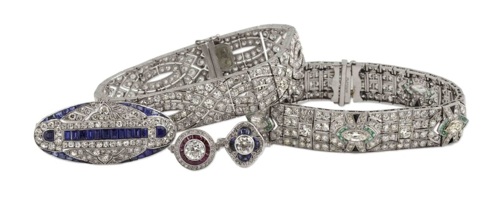 Necklaces were worn long with a pendant or tassel on the end often referred to as a sautoir, rows of pearls (both real and costume thanks to Coco Chanel) would be wrapped multiple times around the neck and earrings were also long, accentuating shorter hair styles and exposed necks. Bracelets could be very fine lines of round diamonds alternately set with calibre cut coloured gems such as sapphires or rubies; geometric openwork links of diamonds and multi-coloured gems or wide straps pave set with diamonds –all styles were worn in multiples, stacked up the wrists and forearms.