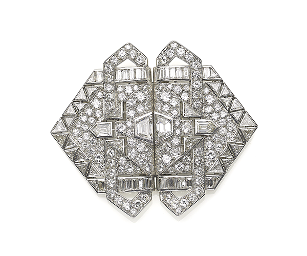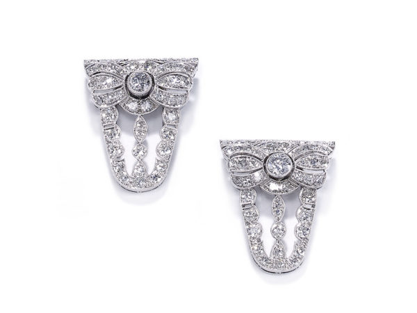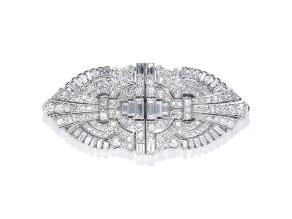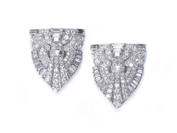 One of the most popular jewels of the period was the double clip brooch which, like many Art Deco pieces, was convertible and could be worn in multiple ways. It was composed of two identical halves fitted together on a frame to make a single brooch and could be worn just as it was or separated and each half worn either singly or together on the lapels of a jacket for instance or the straps of a dress.