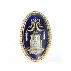 The romantic ‘lover’s eye’ painted miniatures that gained widespread favour were particularly enchanting gifts, the givers identity concealed except for the window to his or her soul framed by pearls, diamonds or coloured gems. Similar motifs were also used in mourning jewellery which saw a pronounced stylistic change during the latter part of the century. The prevalence of graphic depictions of death such as skulls and skeletons which had been borrowed from the Memento Mori tradition gradually waned in favour of columns, urns, weeping willows and female figures in classical robes.