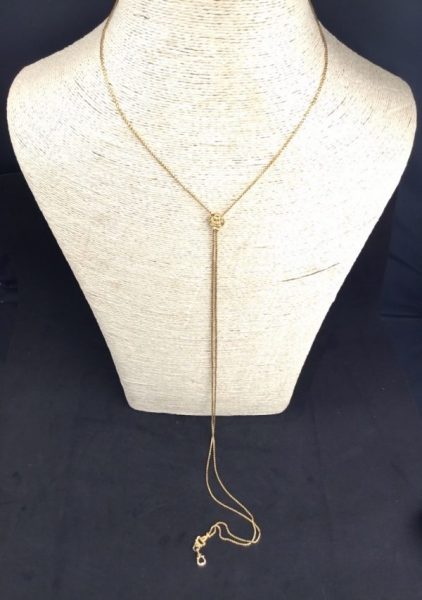 A long necklace often without a clasp, worn in multiple strands can also be worn on the back and fastened at each shoulder