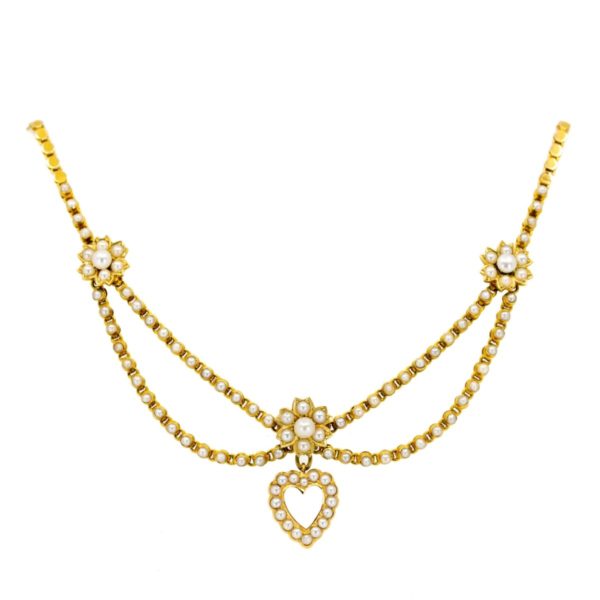 Featuring garlands and swags, gem set or short strings of pearls suspended between two points. A grand necklace of this type was featured in the ‘diamond necklace affair’ in late 18th France and was even said to have helped bring about the French revolution.