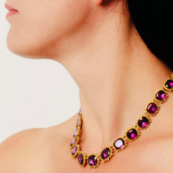 A necklace of individually set gemstones set in a single line though rarely a double riviere is seen. Georgian period riviere necklaces have closed back settings, the gems having a foil backing that helps to reflect the light. Amethyst was used for its strong colouring, but examples set with diamonds, rock crystal or paste are also seen