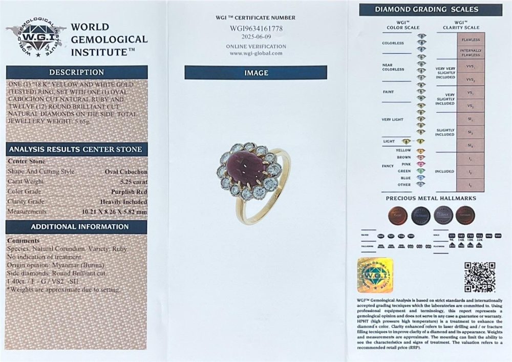 - Ruby: 1 oval cabochon cut natural ruby 5.25 carats ( WGI report)