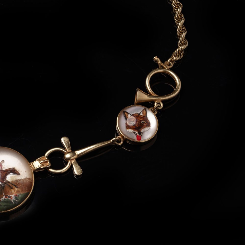 A beautifully composed late Victorian to Edwardian necklace in 14 carat yellow gold, featuring intricately carved and reverse-painted Essex crystals — a rare and labour-intensive technique where miniature paintings are rendered in fine detail on the reverse side of domed rock crystal cabochons. The motifs include huntsman, fox, hound, gold horn and riding crops.