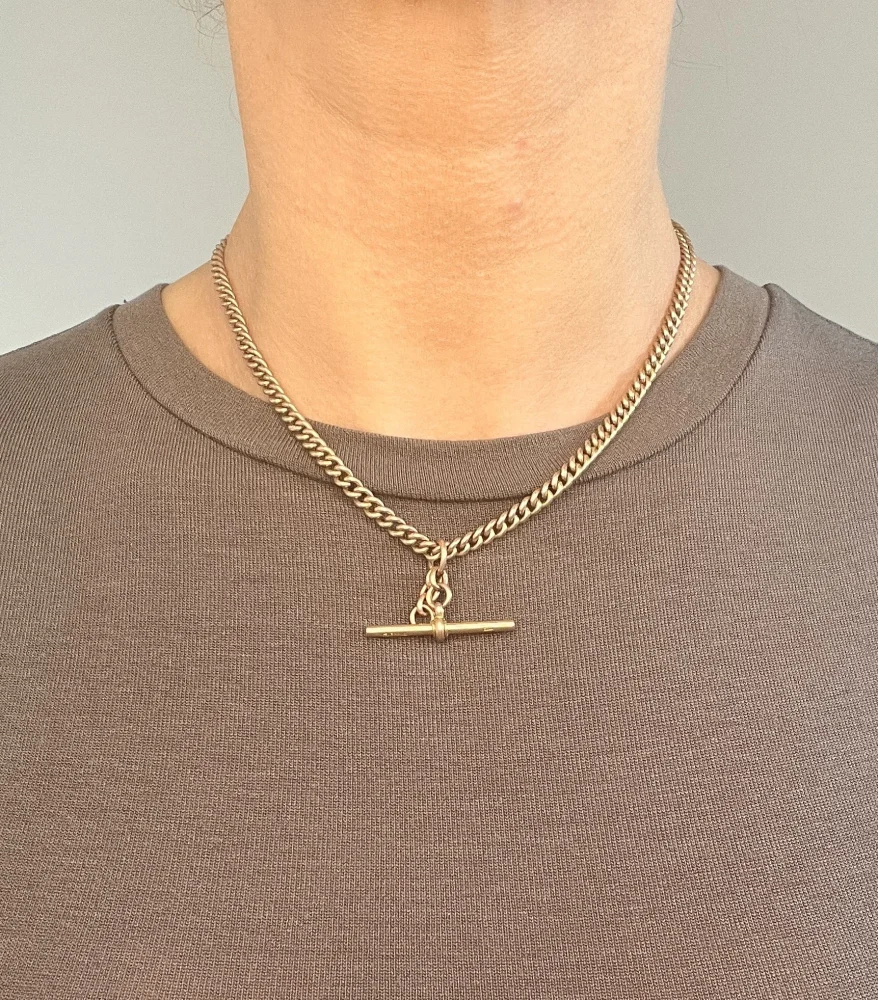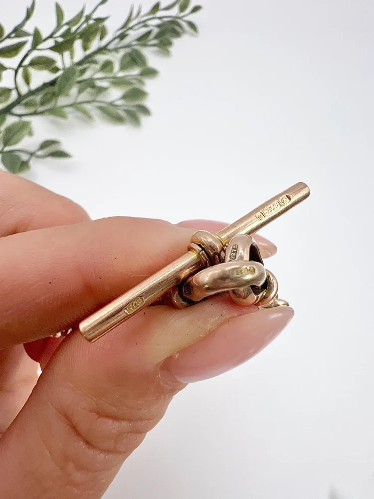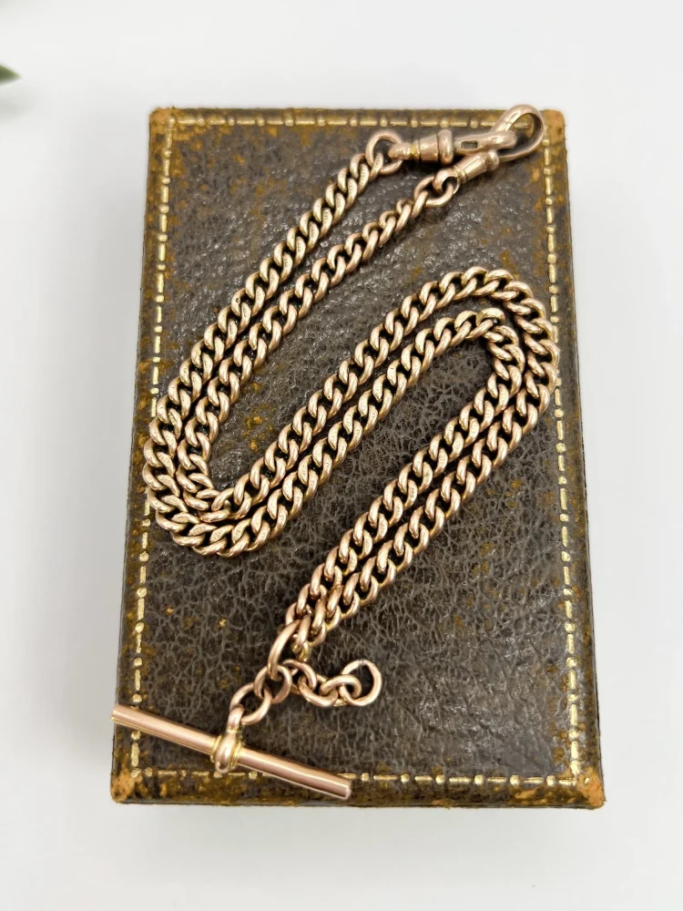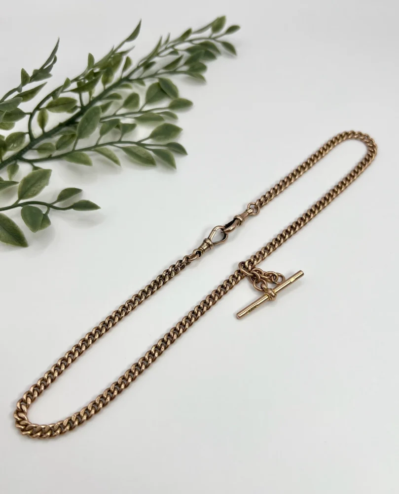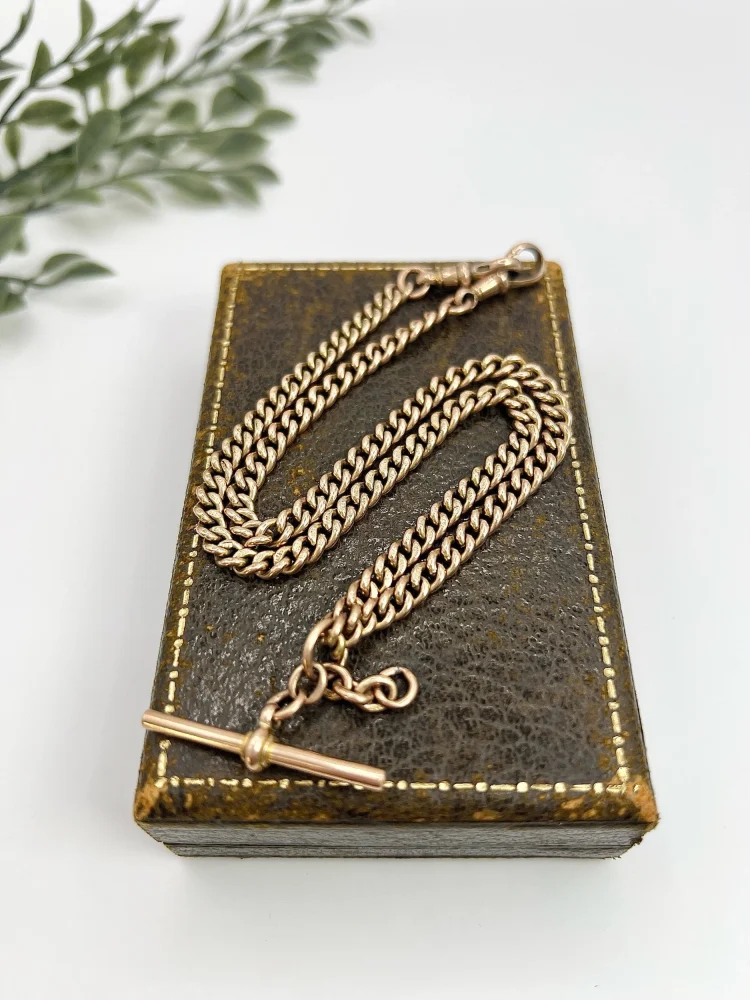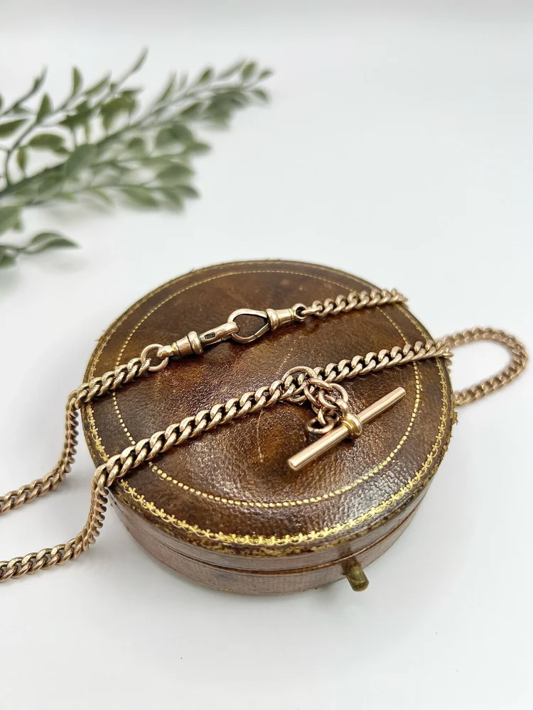 This stunning 9 carat rose gold Albert chain was previously used as a pocket watch chain. This exquisite necklace features two swivel dog clips and a movable t-bar, making it the perfect accessory to add a touch of vintage charm to any outfit.