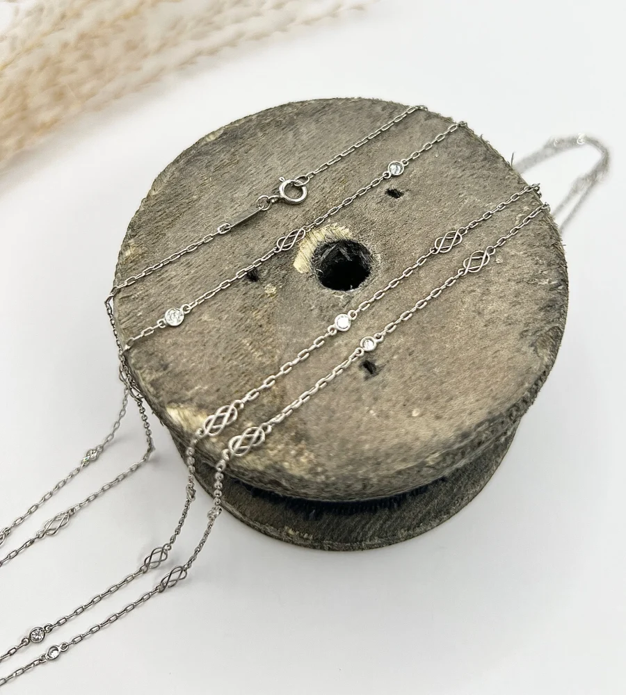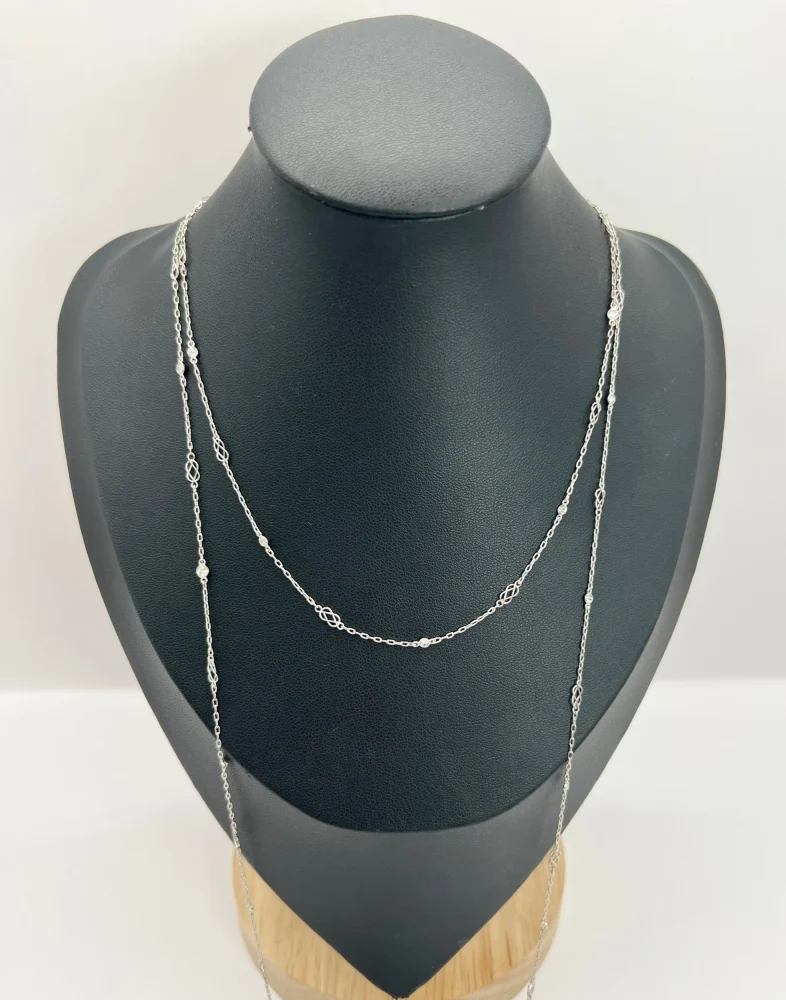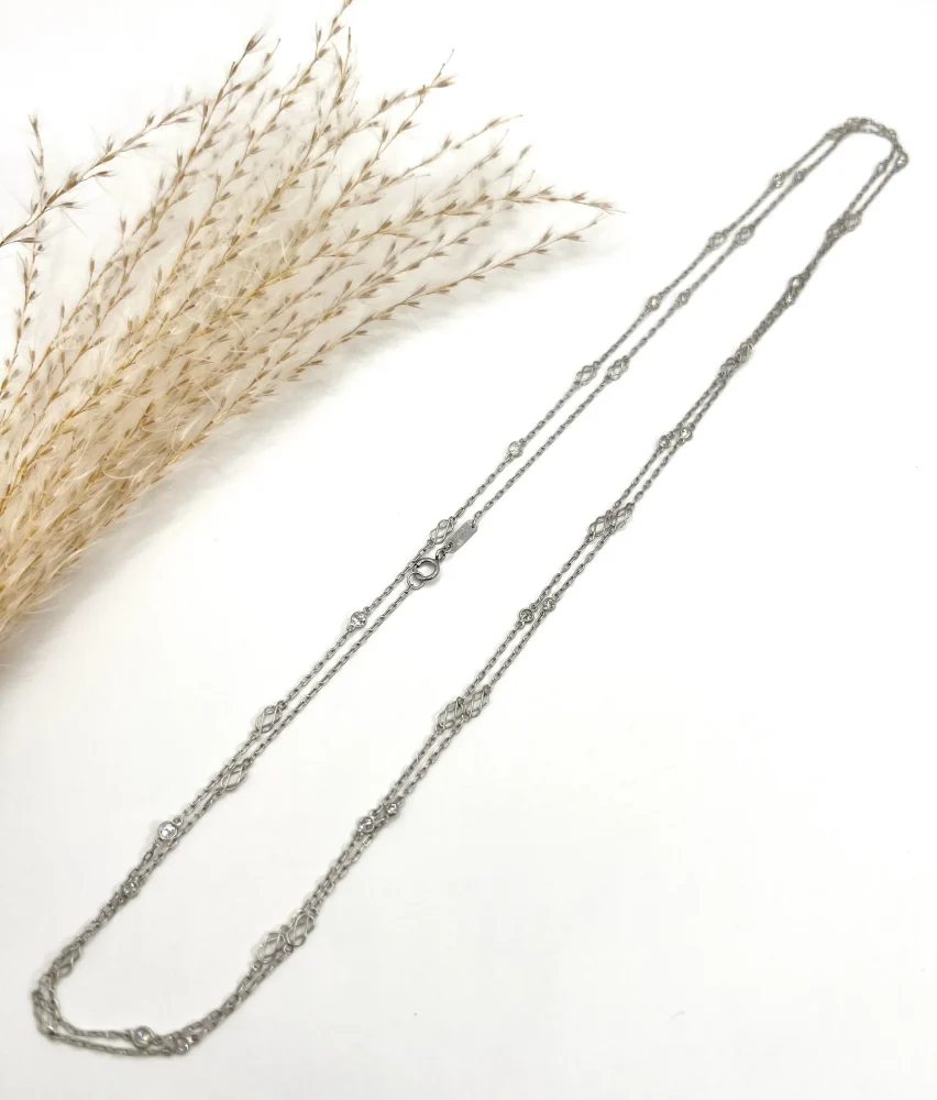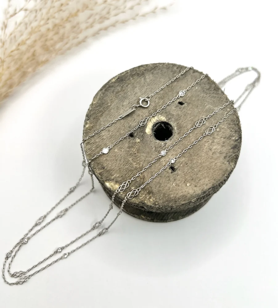 Step back in time to the elegant 1920’s with this exquisite platinum half guard trace chain and lovers knot link chain with a bolt ring clasp,