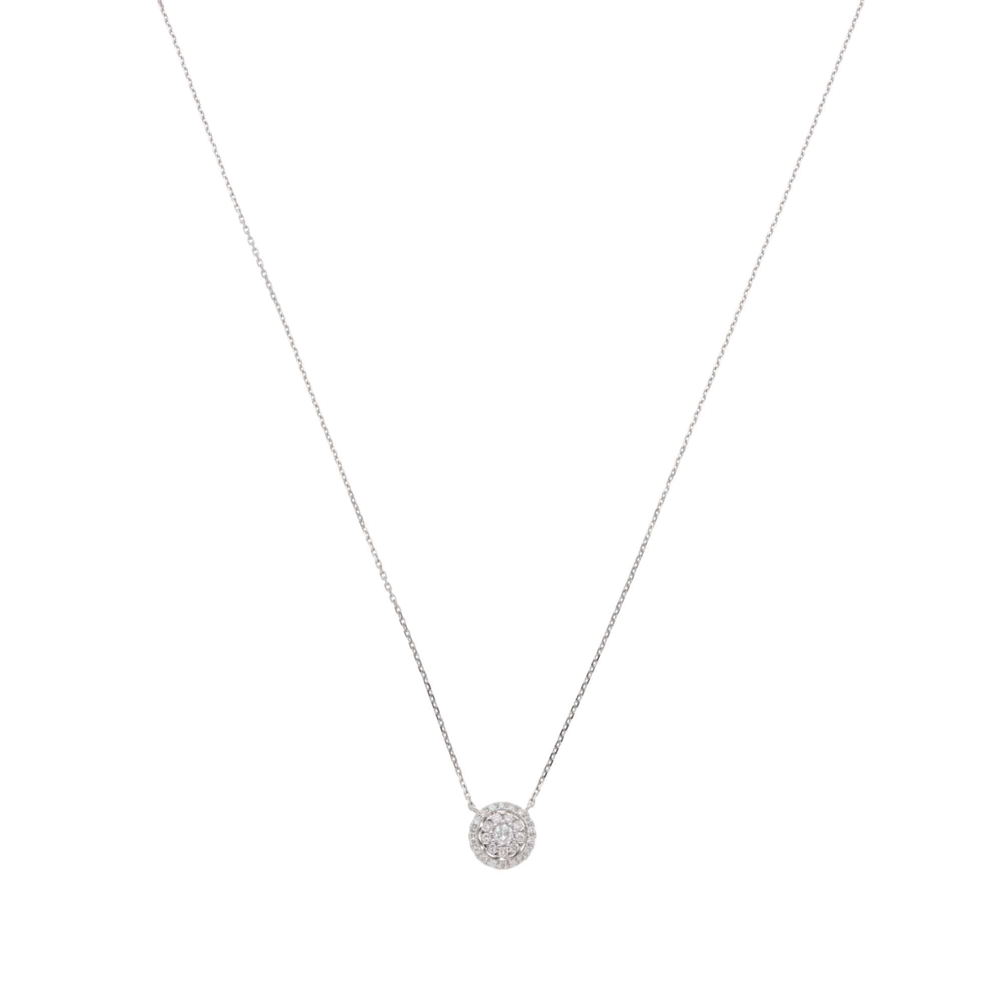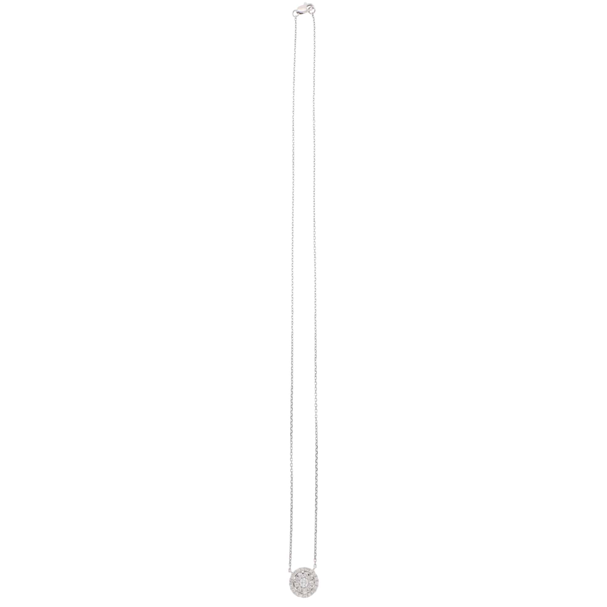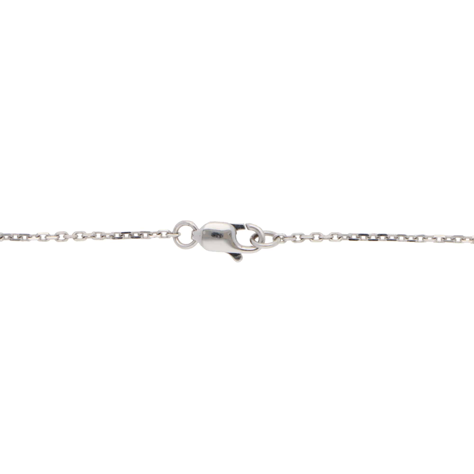 A beautiful contemporary diamond cluster pendant necklace set in 18 carat white gold. The pendant is predominately set with one diamond, surrounded by 27 smaller diamonds. The diamonds are set in micro-claw settings, which beautifully highlights their sparkle and contrasts beautifully with the gold colouring. The pendant hangs elegantly from a white gold trace chain. Due to its design and size, this piece can be worn for a variety of occasions. It is suitable for both everyday and special occasions. Lastly, a valuation for insurance and authenticity will accompany this piece.