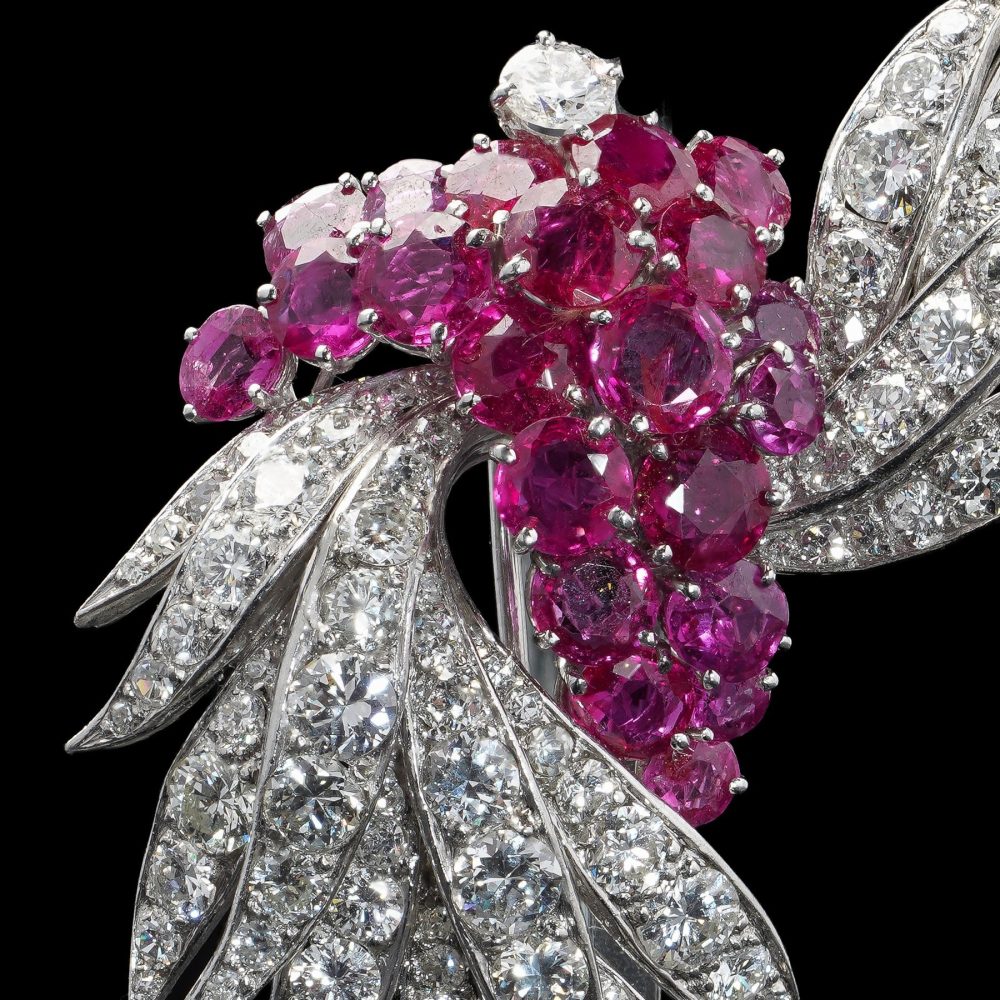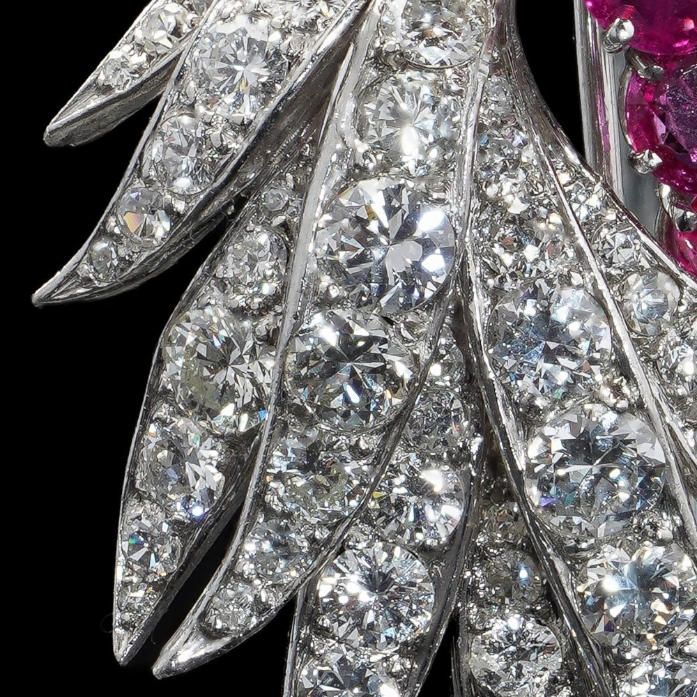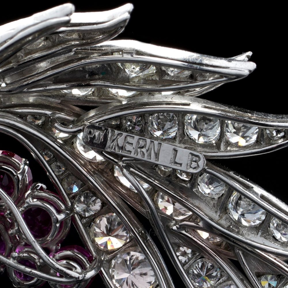 A sophisticated mid-20th century brooch by renowned German jeweller René Kern, crafted in platinum and designed as an elegant floral and foliate spray. The brooch is set with a stunning combination of natural Burmese rubies and diamonds, arranged in a dynamic and flowing composition that reflects the refined elegance of post-war European haute joaillerie.