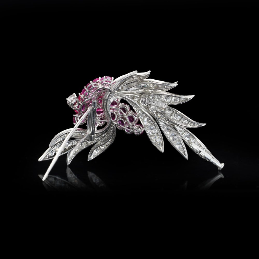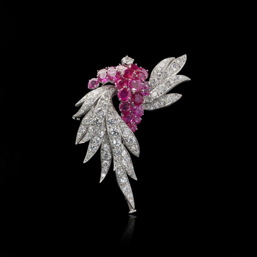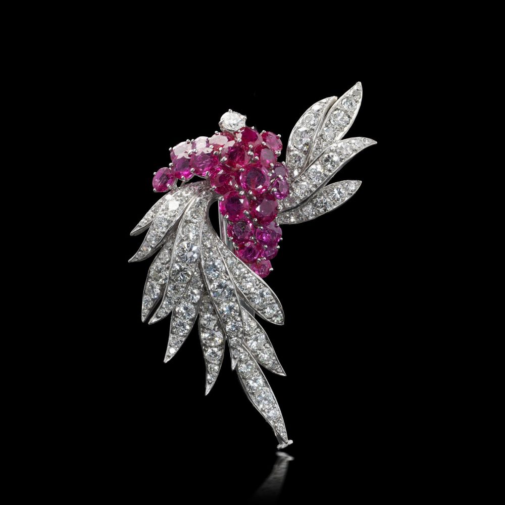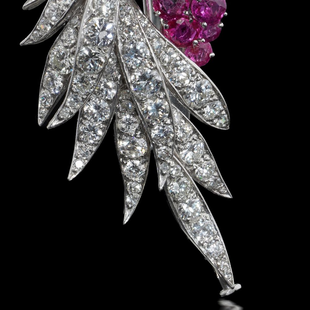 A sophisticated mid-20th century brooch by renowned German jeweller René Kern, crafted in platinum and designed as an elegant floral and foliate spray. The brooch is set with a stunning combination of natural Burmese rubies and diamonds, arranged in a dynamic and flowing composition that reflects the refined elegance of post-war European haute joaillerie.
