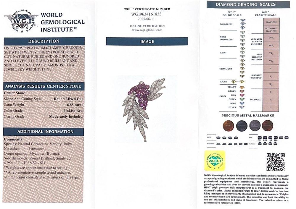 - Diamonds: Round brilliant and single cut diamonds 4.96 carats, colour G – H, clarity VS2 – SI1