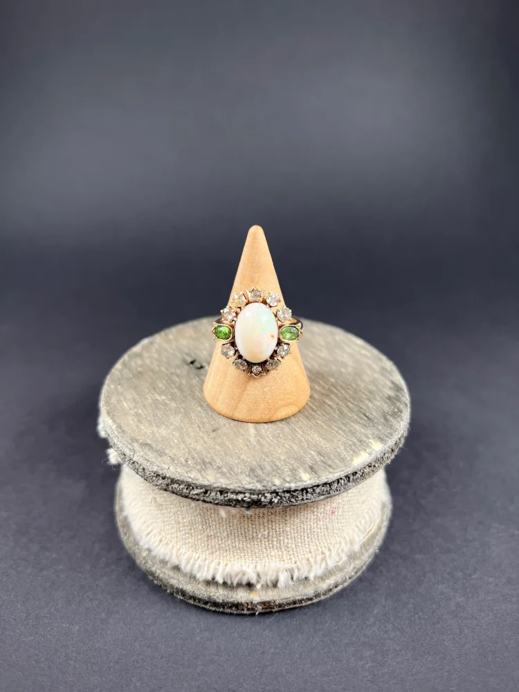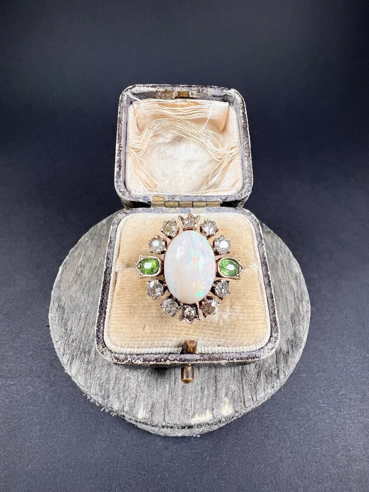 Victorian Antique Opal Diamond and Demantoid Garnet Cluster Ring