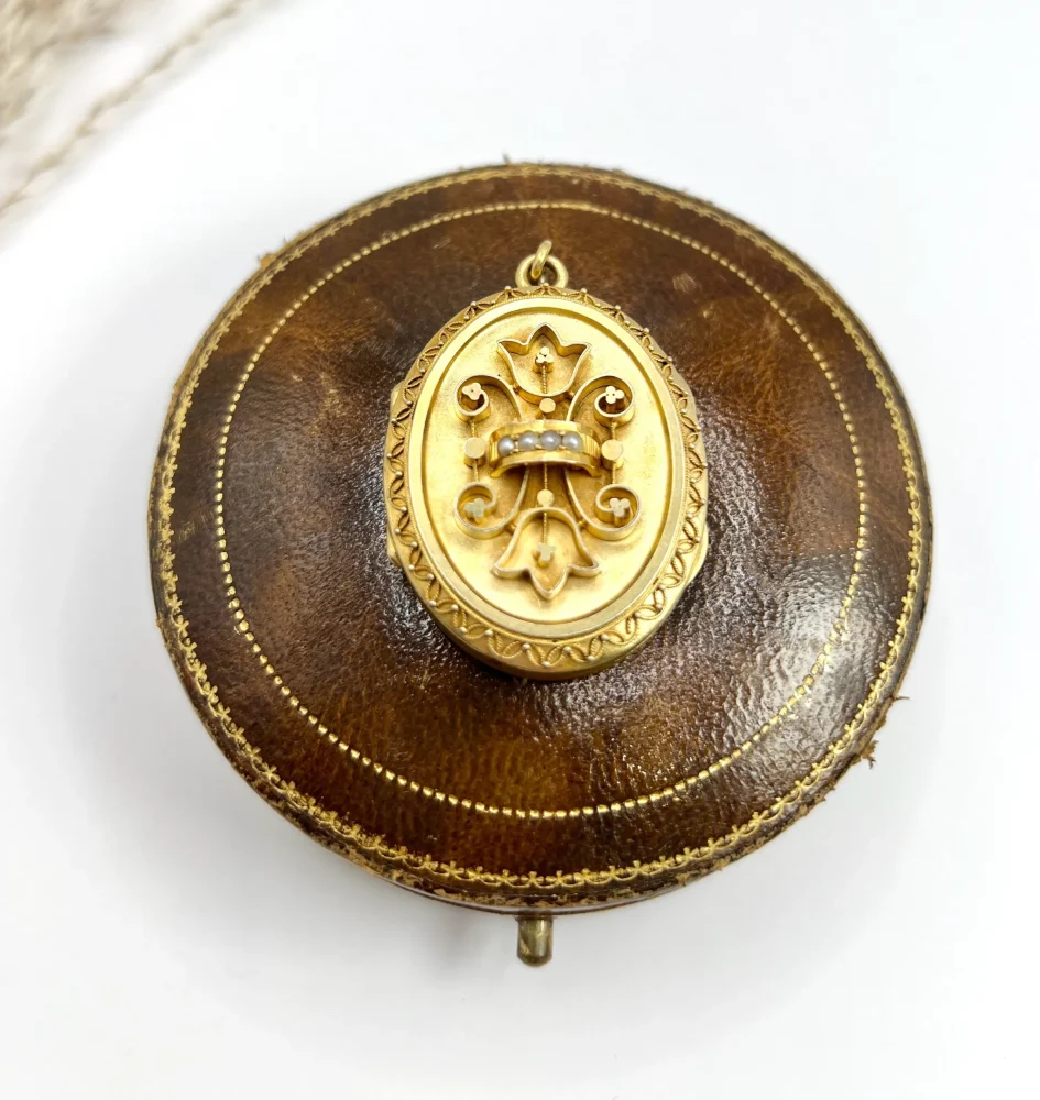 This exquisite Victorian locket is a true treasure. It is crafted from 15 carat yellow gold and showcases stunning Etruscan gold work that reflects the artistry of its time. In fabulous condition, this piece has been meticulously preserved, appearing as if it has been lovingly kept in a jewellery box for the past century. Adorned with natural seed pearls, the locket showcases intricate detailing that enhances its elegance and charm.
