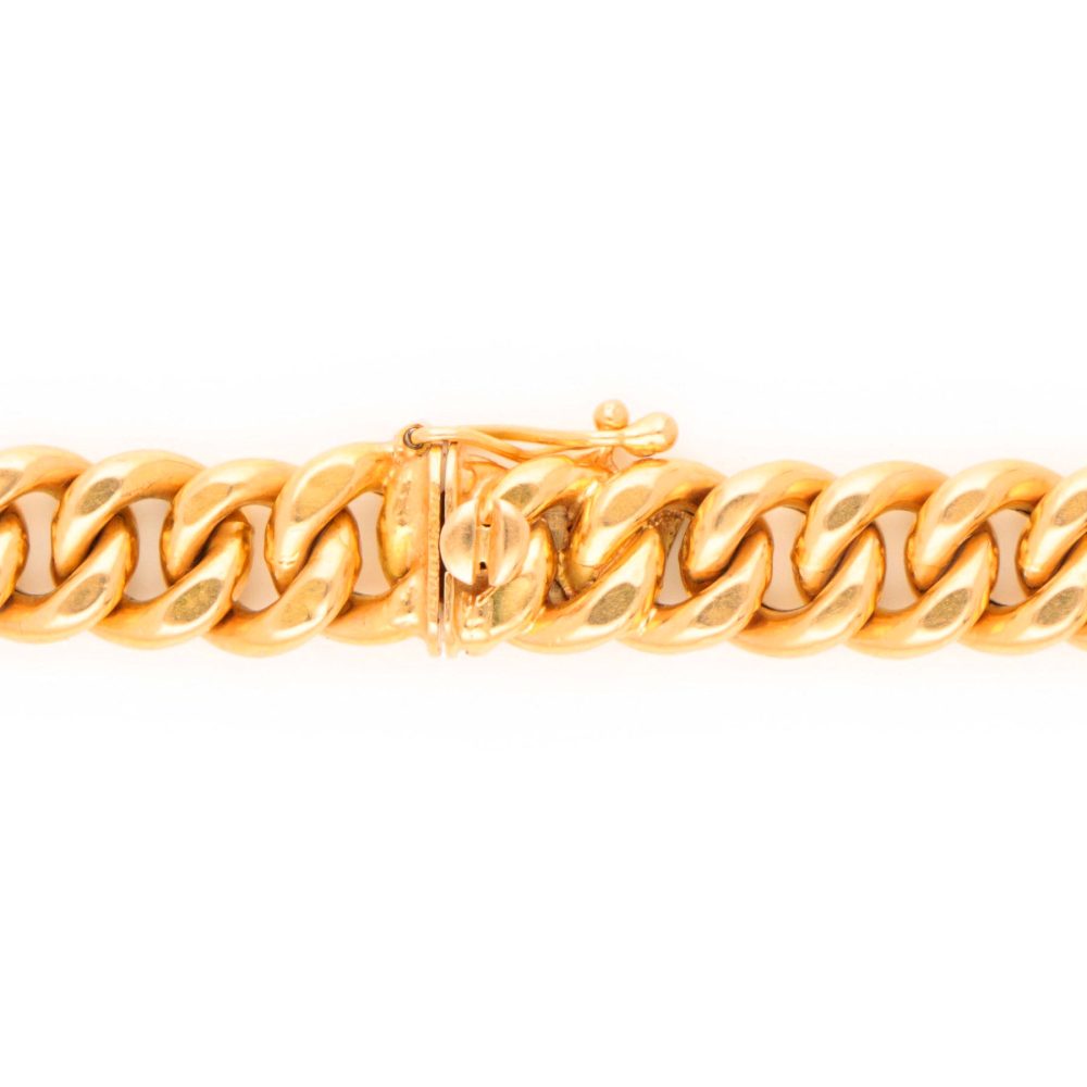 This elegant 18 carat gold curb link necklace features links that gracefully graduate from 7.5 mm to 12 mm at the front, offering a beautifully balanced design. Secured with a box clasp and figure-eight safety catch, it’s a true statement piece.