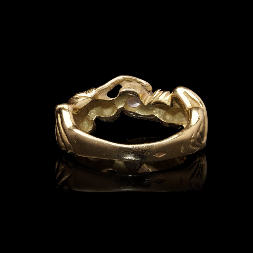 A vintage figural ring crafted in solid 18ct gold in a Neo Classical style, depicting stylised male and female figures. Two arms support a single round brilliant-cut diamond at the centre, symbolically cradled between them. The design captures both form and emotion, making this a highly distinctive piece of wearable art from the mid-20th century. The artistic composition and hand-finished detailing reflect design sensibilities of the 1950s to 1970s vintage mid century period.