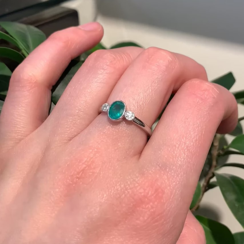 This exquisite vintage trilogy ring showcases an oval-shaped emerald weighing approximately 1.00 carat, elegantly adorned with two old-mine-cut diamonds totalling approximately 0.20 carats (H SI1). All crafted in 14ct white gold. Circa 1970’s.