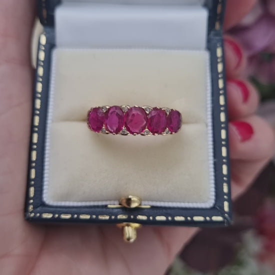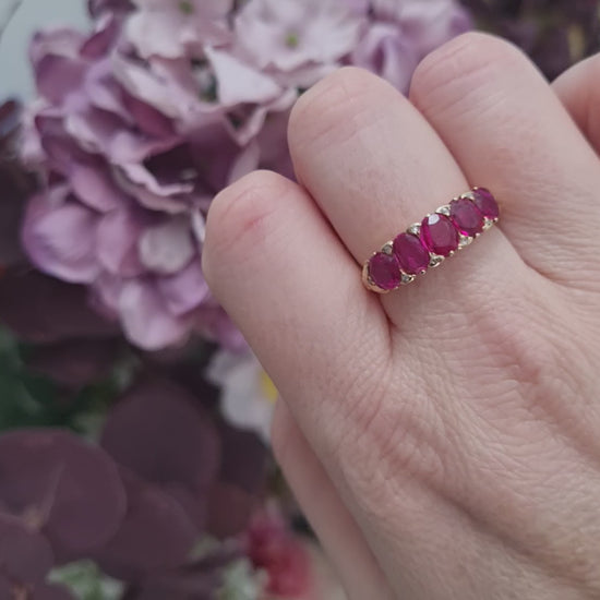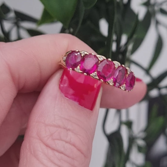 A stunning Victorian five stone ring set with five, certified natural unheated Burmese rubies accented with rose-cut diamond points. Mounted in 18ct yellow gold. Circa 1880.