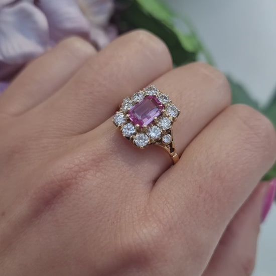 The central 1ct emerald-cut pink sapphire is surrounded by 0.90 carats of sparkling diamonds. Mounted in 18ct yellow gold in a modern setting inspired by antique design.