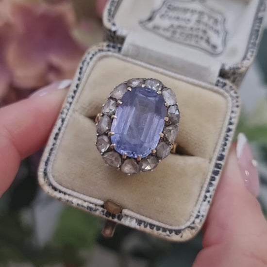 A truly enchanting antique cluster ring, centred with a dreamy oval cushion cut sapphire glowing in soft cornflower-blue tones. The sapphire is encircled by a delicate halo of rose-cut diamonds, their gently faceted surfaces catching the light with a subtle, candlelit shimmer characteristic of early diamonds.