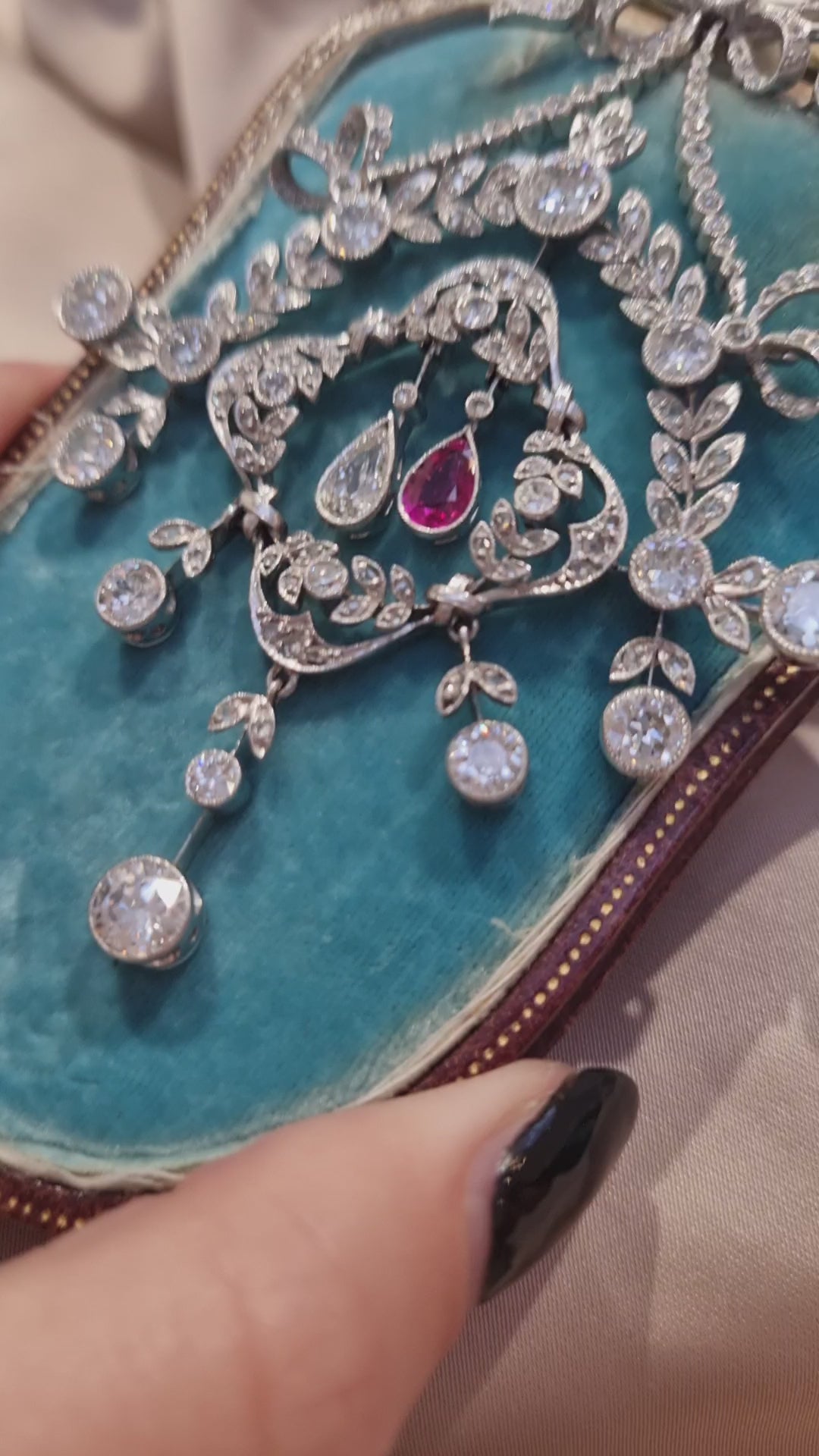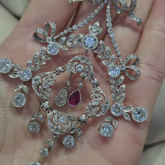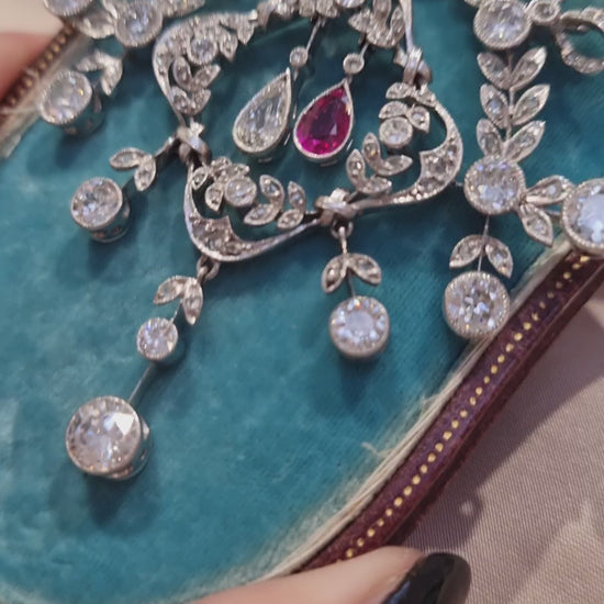 Stunning antique wreath and garland design pendant-come-brooch set with sparkling old cut diamonds with central pear shape ruby and diamond drops