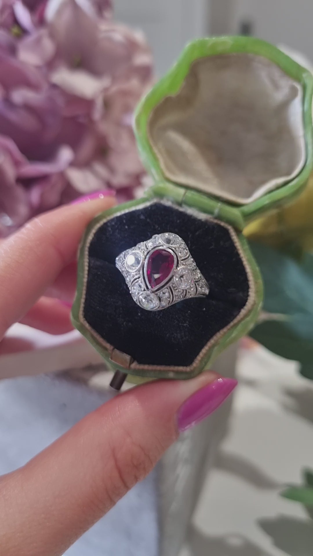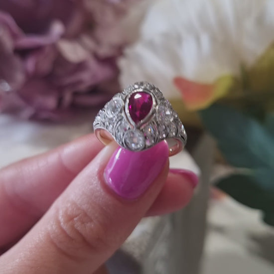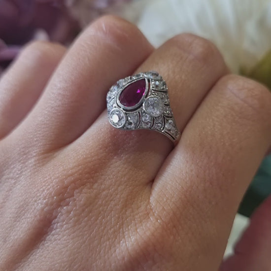 Edwardian Antique Pear Shape Ruby and Diamond Cluster Dress Ring