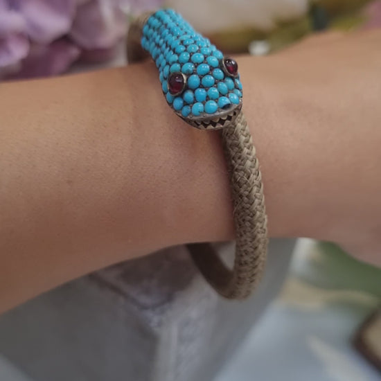 The woven bangle leads to cabochon turquoise head, accented with garnet eyes