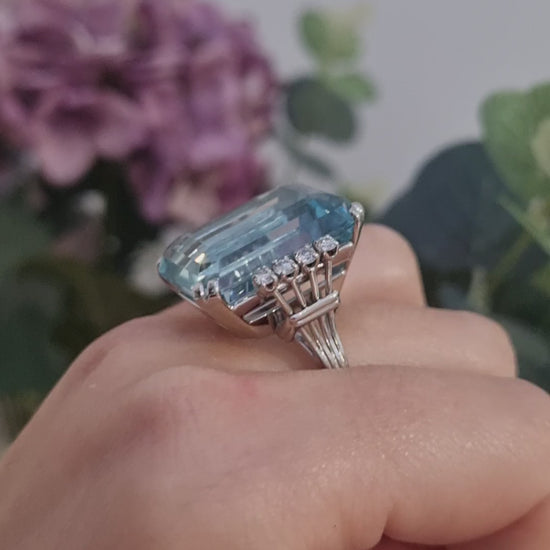 A striking aquamarine statement ring. The large 27.38ct emerald-cut aquamarine is accented with four sparkling diamonds to each side. Mounted in platinum. Circa 1940.
