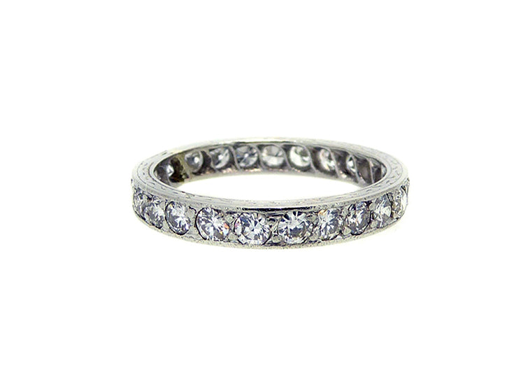 Eternity ring, a band set with a single line of precious gem stones, of identical size, the eternity ring was popularised by the De Beers diamond company in the 20thC. The eternity or infinity ring is often worn by married women, gifted by their husbands on the occasion of an anniversary. Its history goes back to ancient times, in the Elizabethan period it was known as an alliance ring and was in the form of a snake biting its own tail.