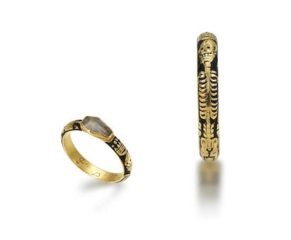 Memento Mori rings, were worn from the 16thto the 18thC, Memento Mori translates as ‘Remember you will die’ The sentiment and the symbols of skulls, full skeletons and coffins which seem macabre by todays standards, were actually a reminder to live piously and to a moral code.