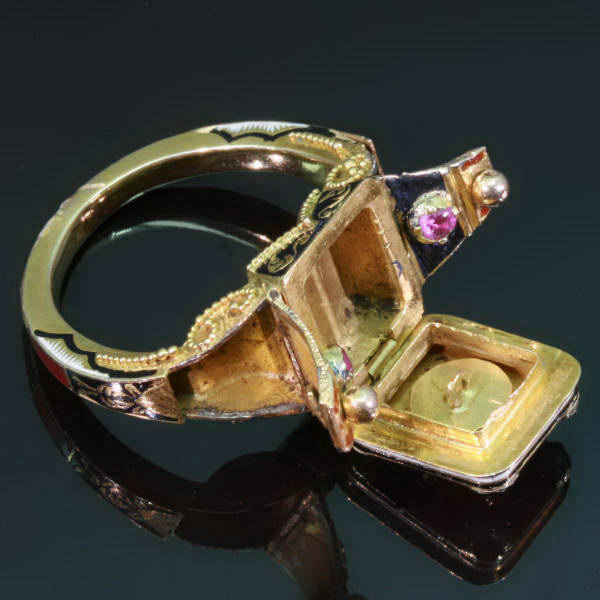 Poison ring, a ring with a secret hinged compartment, although there are references to poison rings in literature, it is probable that these actually contained perfumed oil or religious relics