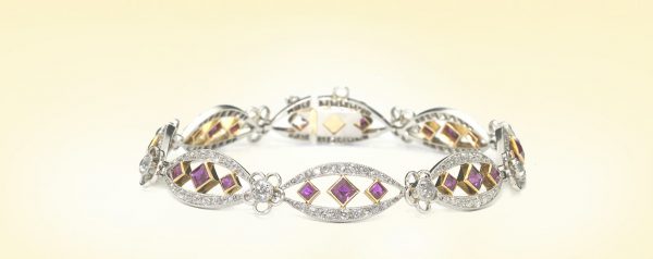 In antique jewellery enamel provides a wonderful back drop to diamonds, it is made by fusing molten glass on to metal but like other materials in a closed back setting should not be exposed to water, as any liquid could become trapped between the two surfaces causing the enamel to crack.